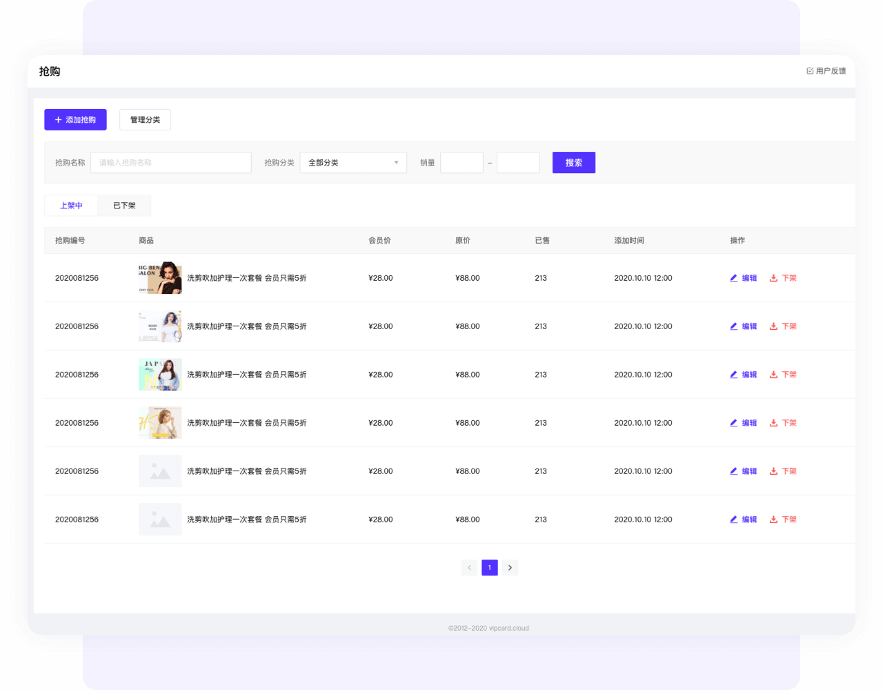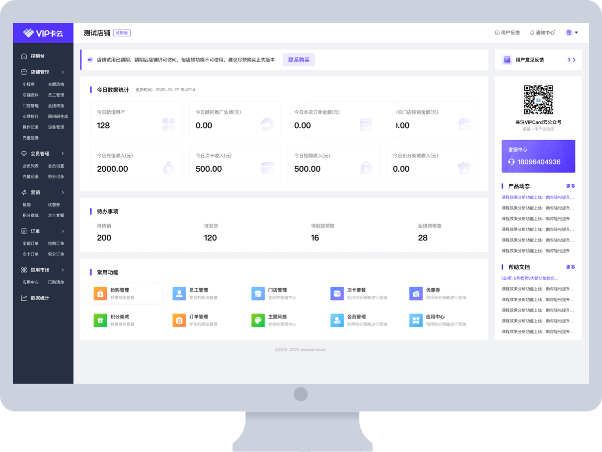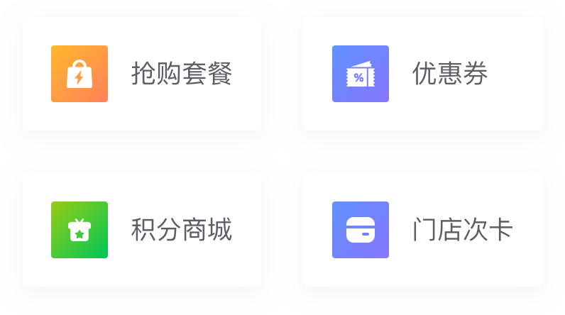 包括抢购套餐管理、优惠券管理、积分商城管理、次卡管理