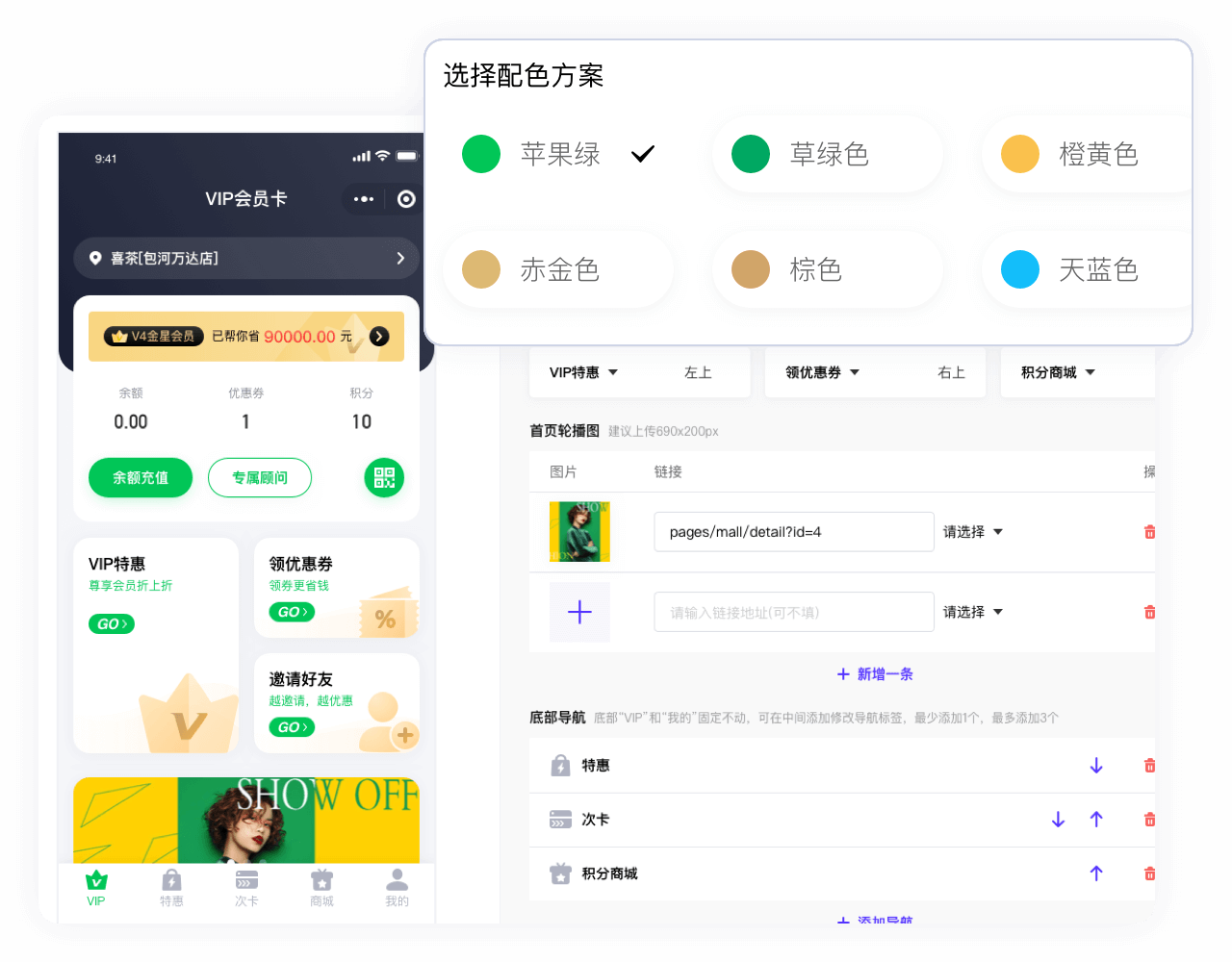 为了满足个性化设置,商户可对小程序店铺配色方案、首页宫格卡片入口、首页轮播图、首页底部导航进行设置;