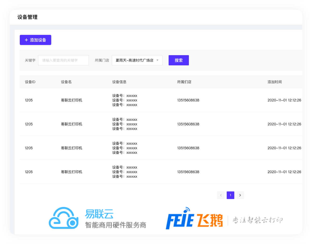 小票打印机(支持飞鹅和易联云打印机)设备管理,商户可添加设备,设备信息包含:设备ID、设备名、设备号、所属门店;