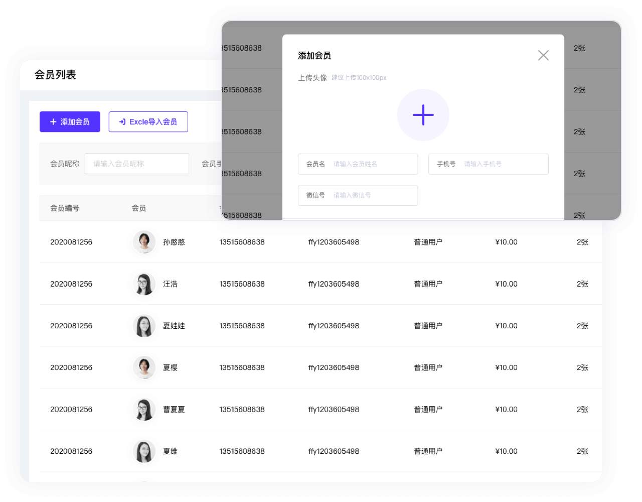 商户可通过手动添加会员也可以EXCEL导入会员。