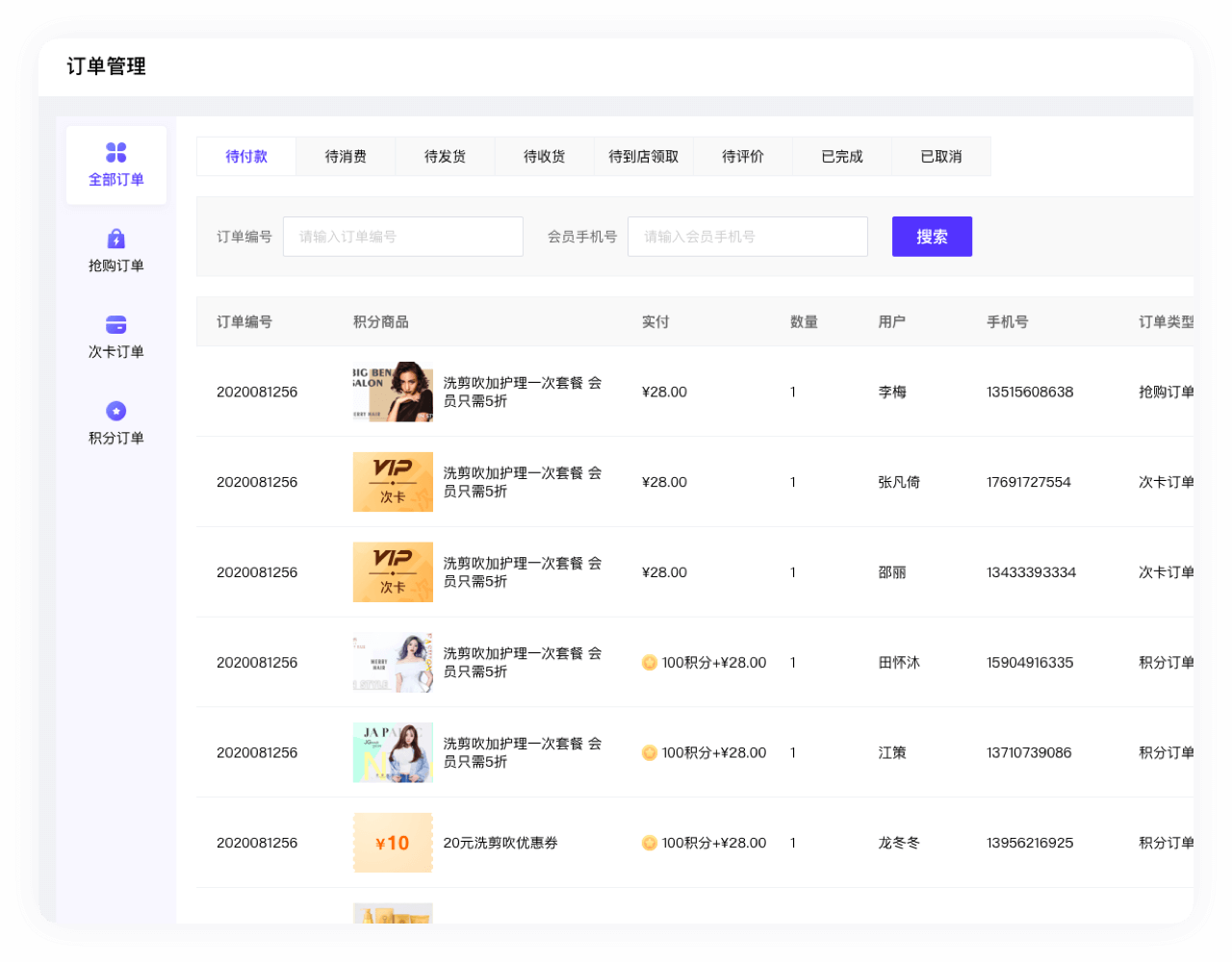 商家可查看各种类型的订单,包括:抢购订单、次卡订单、积分订单(积分套餐订单、积分优惠券订单、积分实物订单)