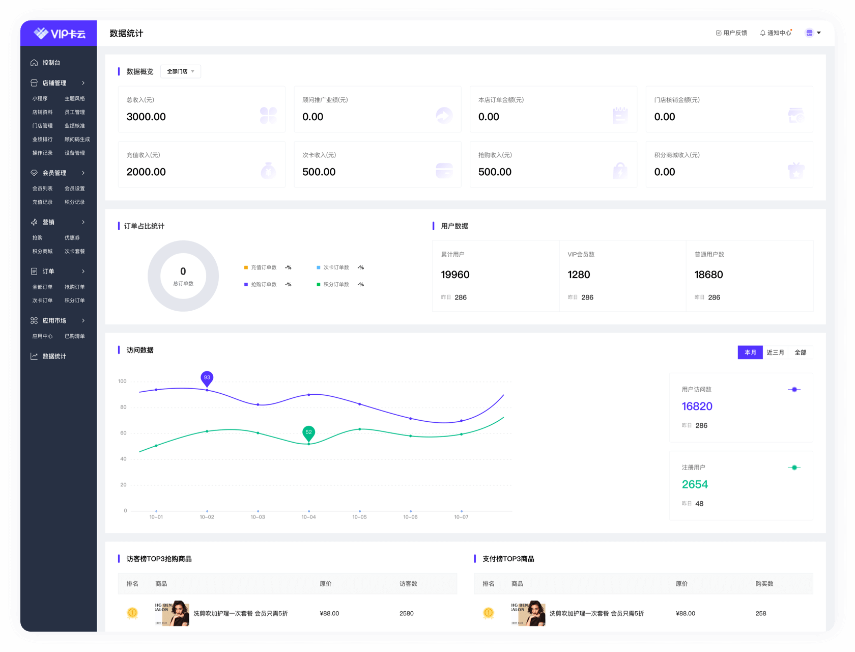 店铺管理、会员管理、营销管理、订单管理、数据统计